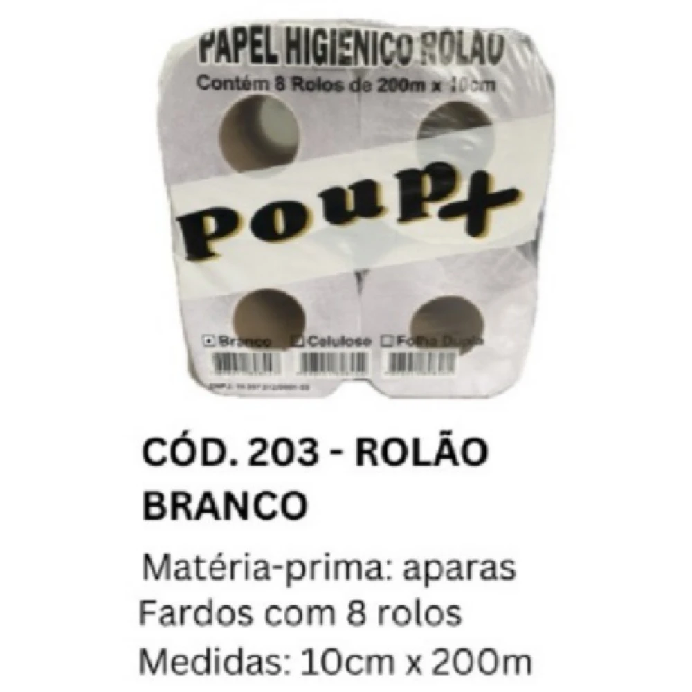 Papel Higiênico Rolão Folha-Simples (Branco-Plus) 18gr Fardo (8 Rolos x 200m x 10cm Altura) Poup+ Kirius 203